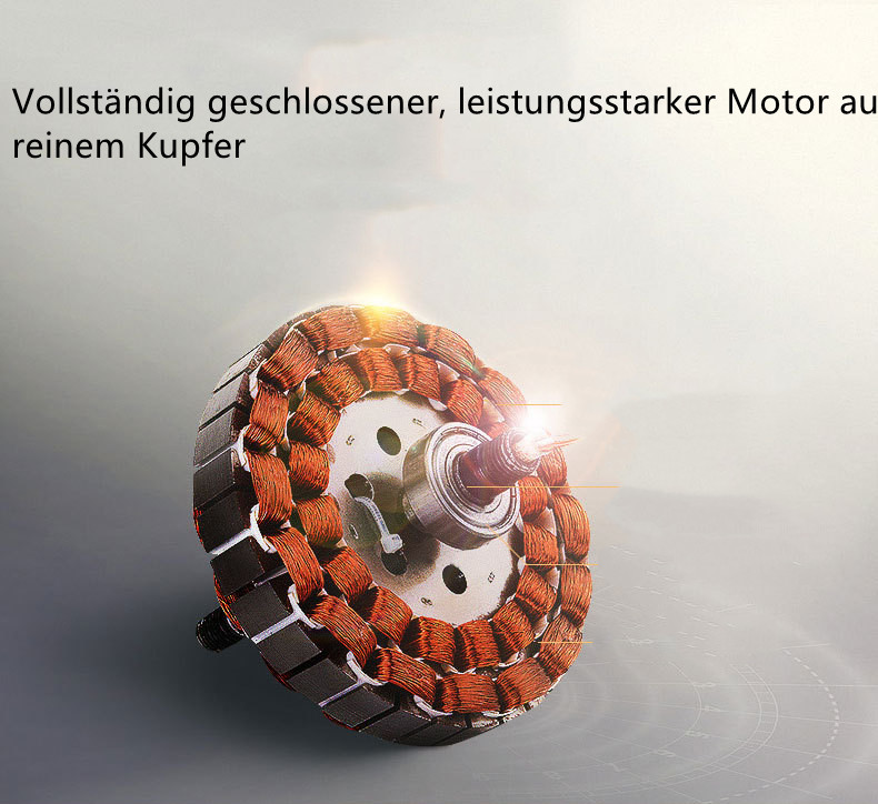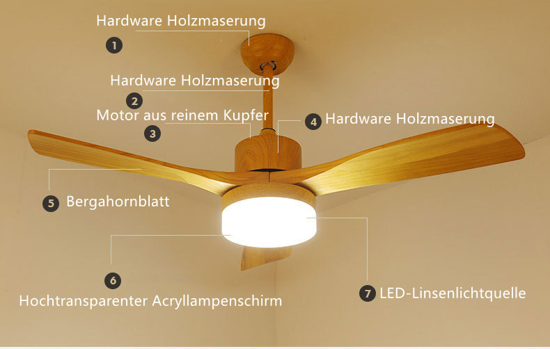 Stabile Rotation: Vollständig geschlossener, leistungsstarker Lüftermotor aus reinem Kupfer und Massivholzflügel.