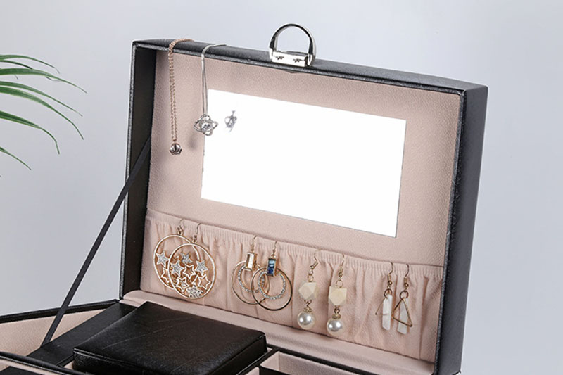 • Mit Spiegel, Spiegel im Deckel mit daneben angebrachtem Lochgurt für Ohrstecker und -hänger, Creolen, oder dünne Halsketten
