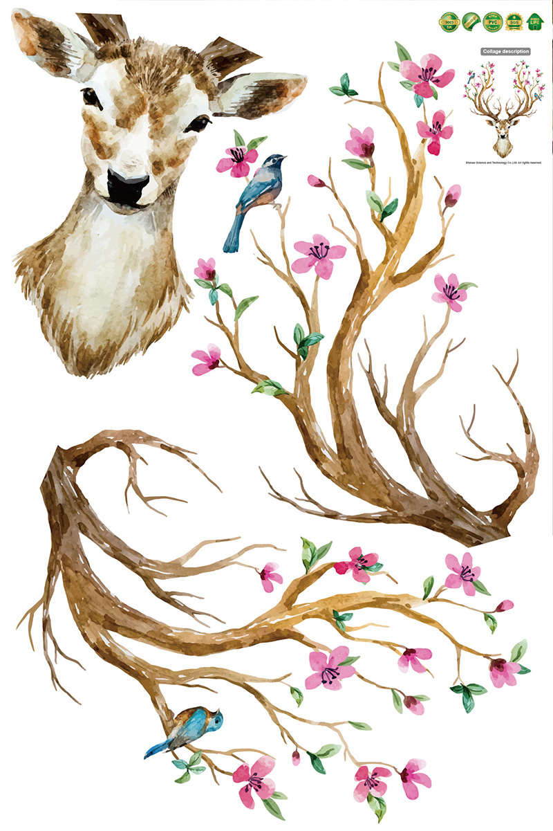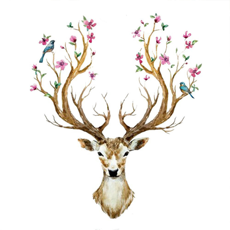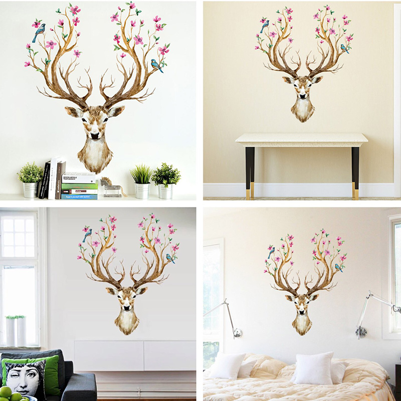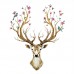 Wandtattoo "Im Frühjahr blühende Hirsch Geweih" mit Blumen und Vögeln | Wandbild: 97x81cm | Wandsticker Hirschkopf Tiere Wand Aufkleber Deko für Wohnzimmer Küche Garderobe Flur