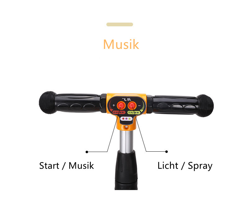 Der Kinderroller verfügt über 2 große vordere Räder und kleine hintere Räder.